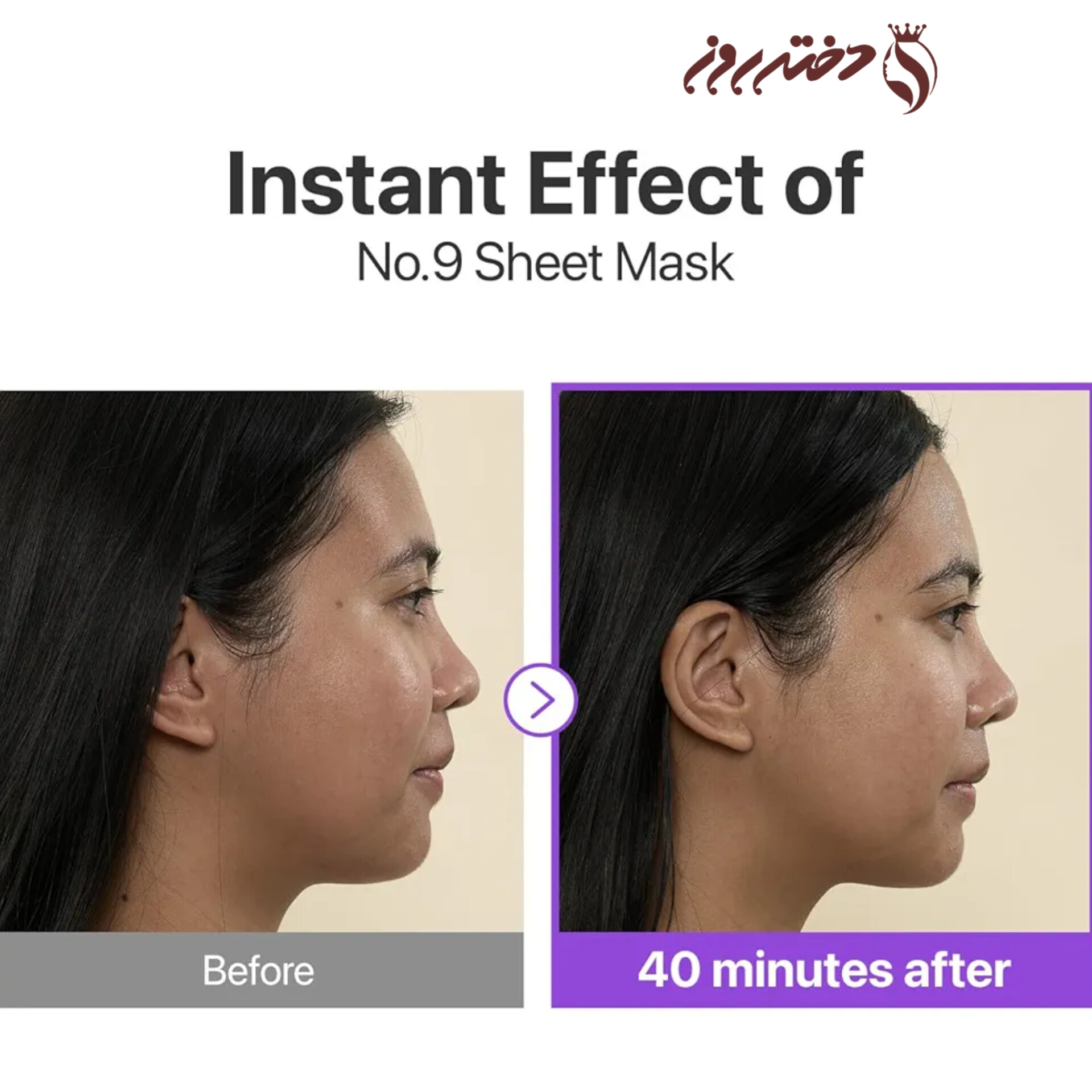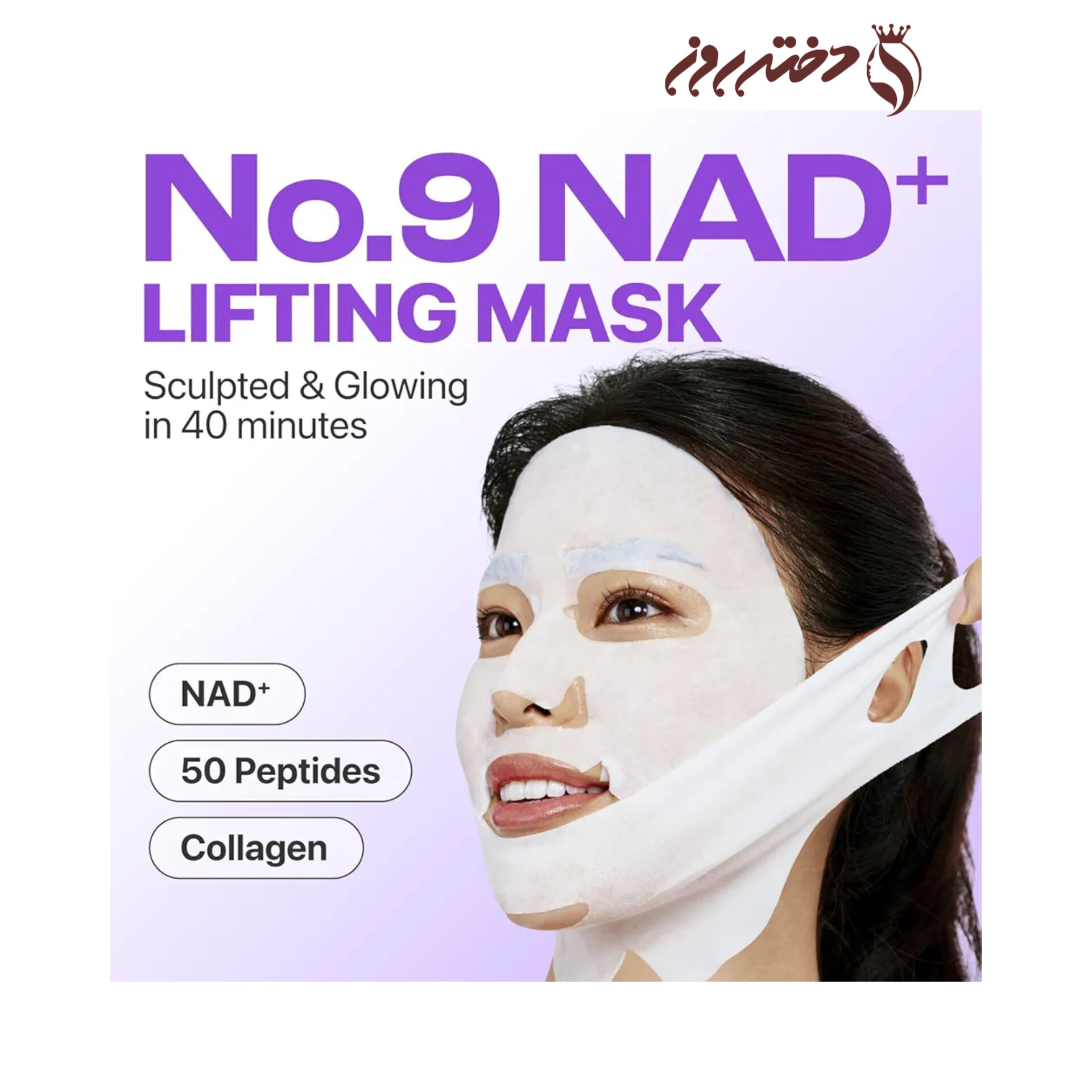 ماسک No.9 NAD+ BIO Lifting-sil Full Face Mask از Numbuzin یک ماسک ورقهای پیشرفته با طراحی دو قسمتی است که با ترکیبی از NAD+ BIO، پپتیدها، کلاژن هیدرولیزشده و باند لیفتینگ مخصوص، به صورت استحکامبخشی، لیفتینگ و تقویت ساختار پوست عمل میکند.
