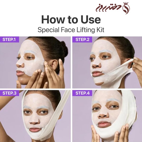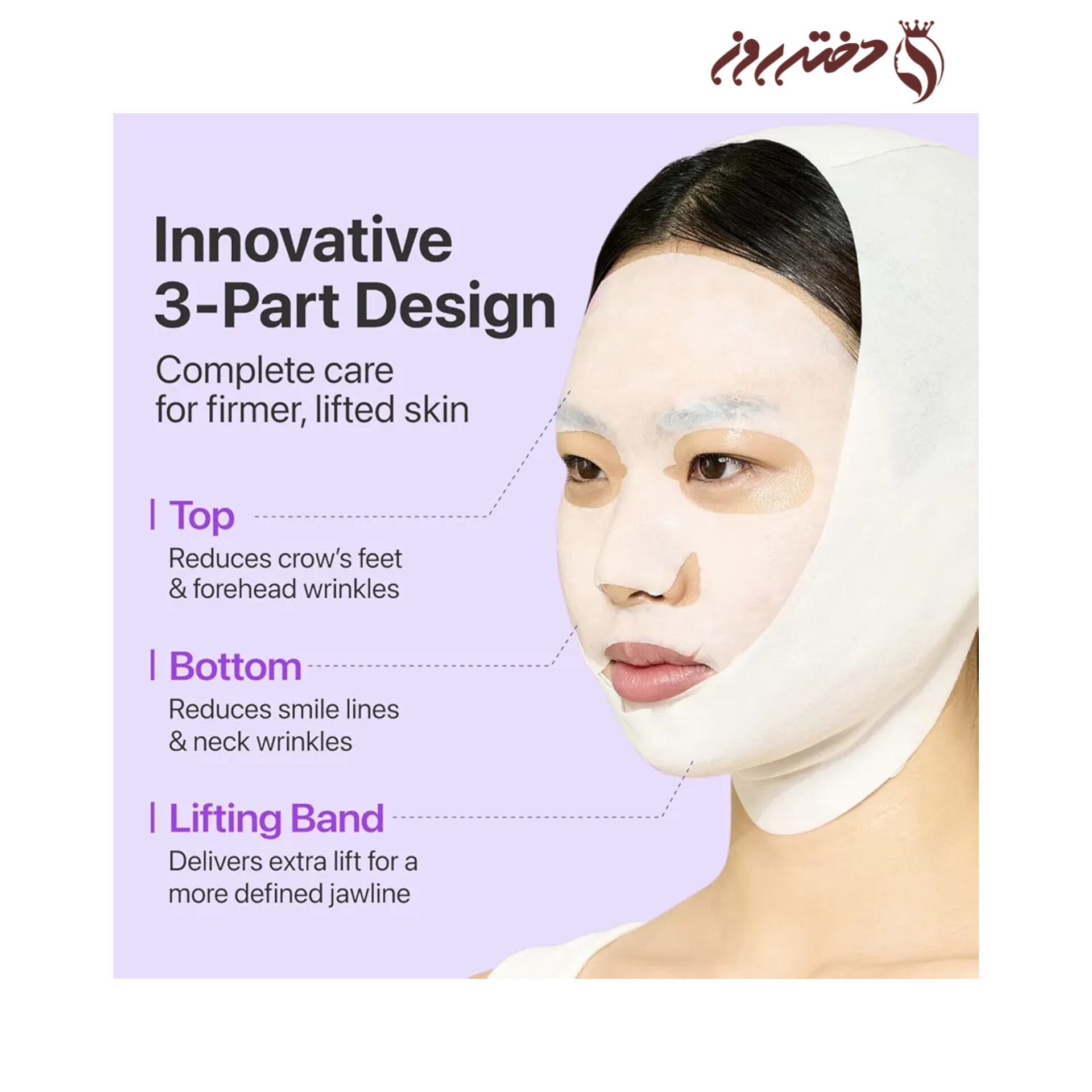 این ماسک شامل ۴ عدد ماسک ورقهای (Top + Bottom) همراه با باند لیفتینگ قابل تنظیم است که میتواند بهطور همزمان باعث لیفت پوست، سفتی، تعریف بهتر خط فک و شادابی بیشتر شود.